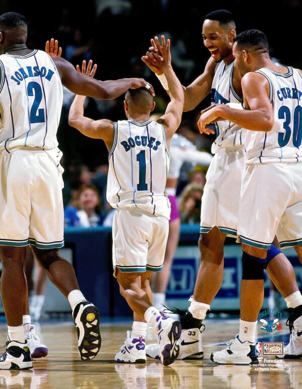 Muggsy Bogues Charlotte Hornets Unsigned Hardwood Classics Teammate Celebration Photograph