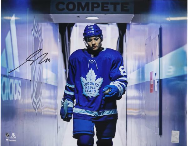 Nick Robertson Toronto Maple Leafs Autographed 16″ x 20″ Blue Jersey Walking Down the Tunnel Photograph