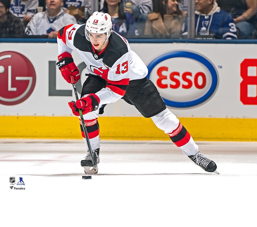 / Nico Hischier New Jersey Devils Unsigned White Jersey Skating Photograph