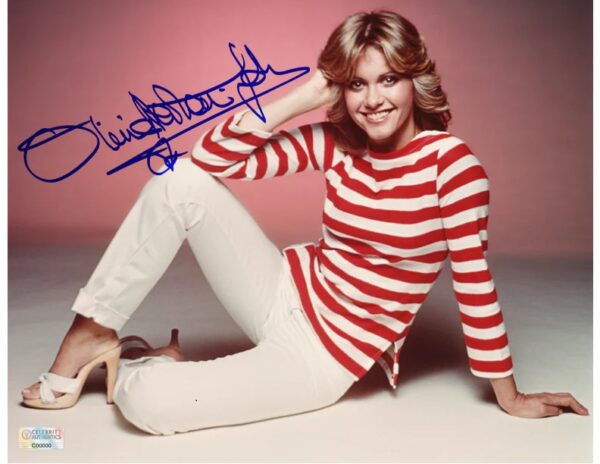 This beautiful 8x10 Studio Photo of the lovely Olivia Newton-John has been personally hand-signed by Olivia during her exclusive signing with Celebrity Authentics. Olivia is a four-time Grammy Award winner whose chart career includes five US number ones and another ten Top Tens on Billboard's Hot 100, two Billboard's 200 number-one albums. Eleven of her singles (including two Platinum) and 14 of her albums (including two Platinum and four 2× Platinum) have been certified Gold. She has sold an estimated 100 million records worldwide, making her one of the best-selling music artists of all time. In 1978, she starred in the musical film Grease, whose soundtrack remains one of the most successful in history. Ships affixed with Celebrity Authentics serial-numbered and tamper evident Authentication Hologram and includes Celebrity Authentics Certificate of Authenticity featuring picture of Olivia signing photo.