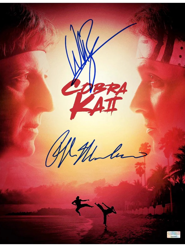 From the Netflix hit Cobra Kai is this 11x14 Photo personally autographed by Ralph Macchio (Daniel LaRusso) and Billy Zabka (Johnny Lawrence) during their signings with Celebrity Authentics. Decades after the tournament that changed their lives, the rivalry between Johnny and Daniel reignites in this sequel to the "Karate Kid" films. This fantastic photo ships affixed with Celebrity Authentics serial-numbered and tamper evident Authentication hologram and includes Celebrity Authentics Certificates of Authenticity featuring picture of Ralph and Billy signing photo.