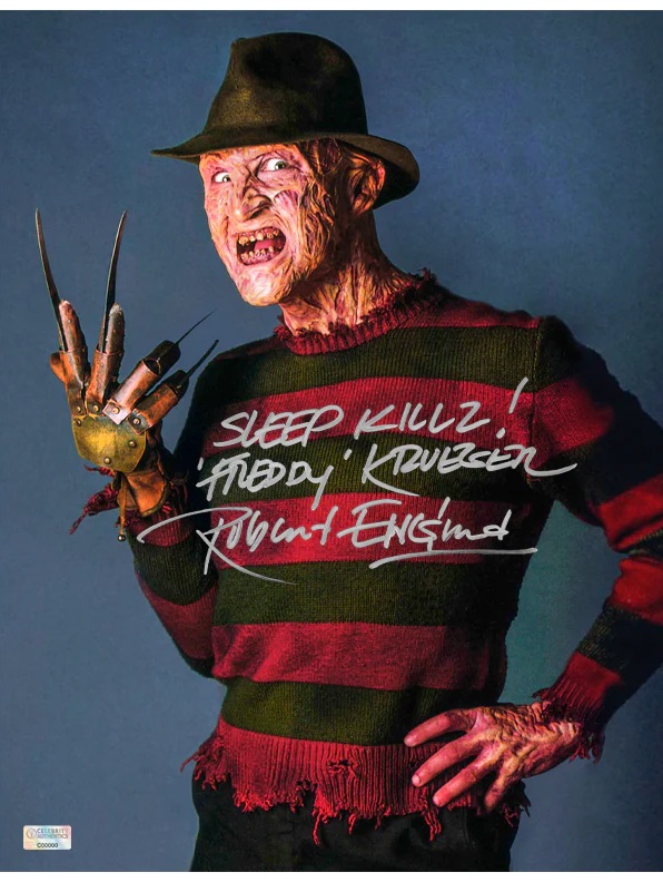 This terrifying 11x14 Photo of the menacing Freddy Krueger from A Nightmare on Elm Street has been personally hand-signed by Robert Englund during his autograph signing with Celebrity Authentics. Amazing shot featuring rare 'Sleep Killz! Freddy Krueger' inscription! Ships affixed with Celebrity Authentics serial-numbered and tamper evident Authentication Hologram and includes Celebrity Authentics Certificate of Authenticity featuring picture of Robert signing photo.