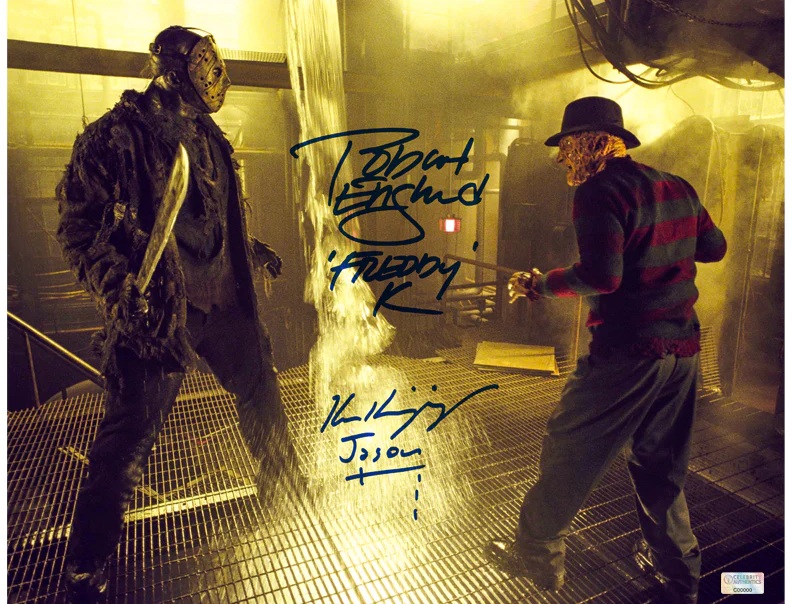 Freddy Krueger and Jason Voorhees, two all time horror icons have terrorized teenagers for years and now they are after each other in Freddy Vs Jason! We are pleased to present this 11x14 scene photo personally hand-signed by Robert Englund (Freddy Krueger) and Ken Kirzinger (Jason) during their signings with Celebrity Authentics. Ships affixed with the Celebrity Authentics serial-numbered and tamper evident Authentication Hologram and includes Celebrity Authentics Certificates of Authenticity featuring picture of Robert and Ken signing photo.