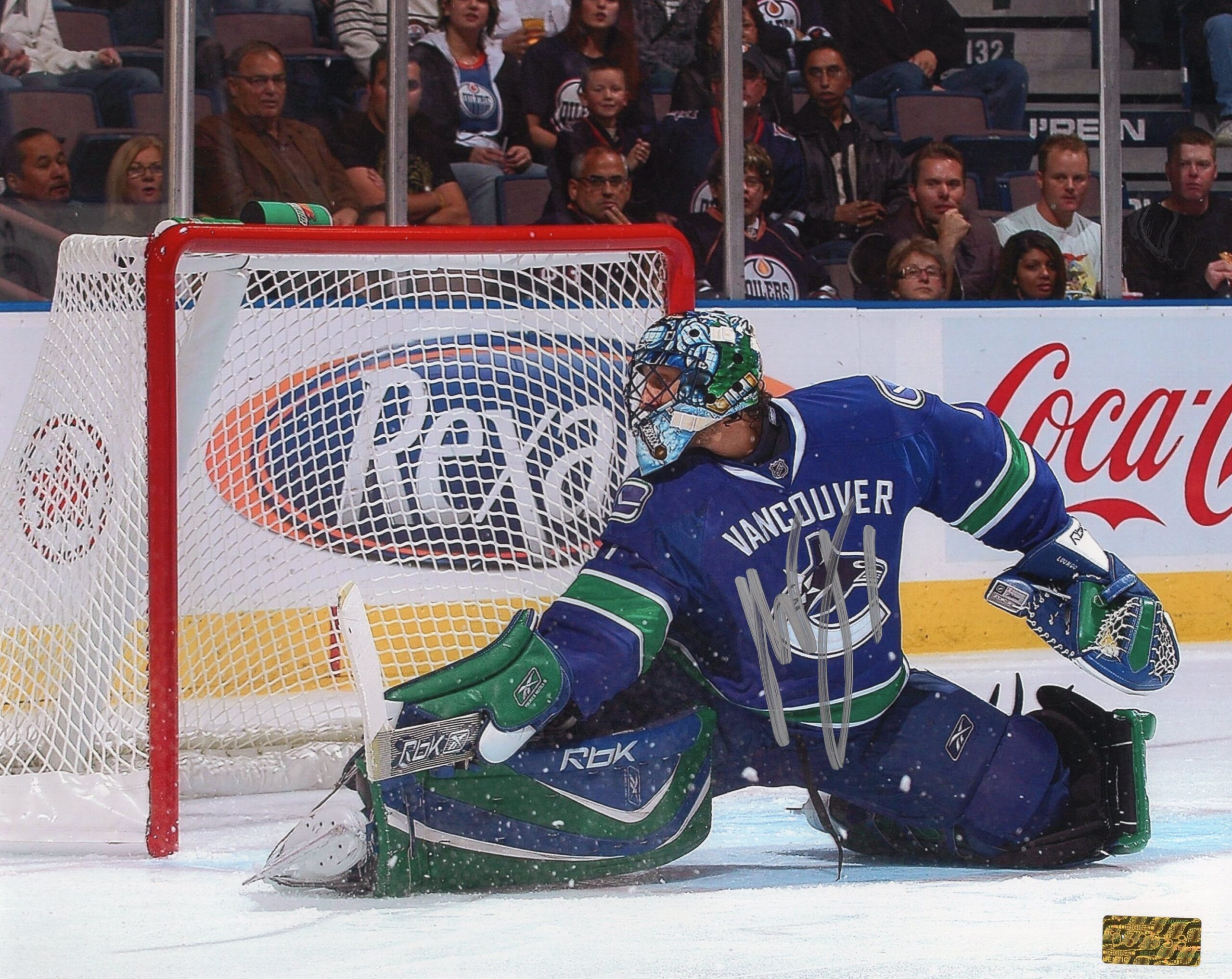 Roberto Luongo Autographed Vancouver Canucks Goalie 8x10 Photo — a classic goalie-in-net pose, licensed, with an official certificate/hologram of authenticity. Great if you want a straightforward Luongo “in-net” shot.