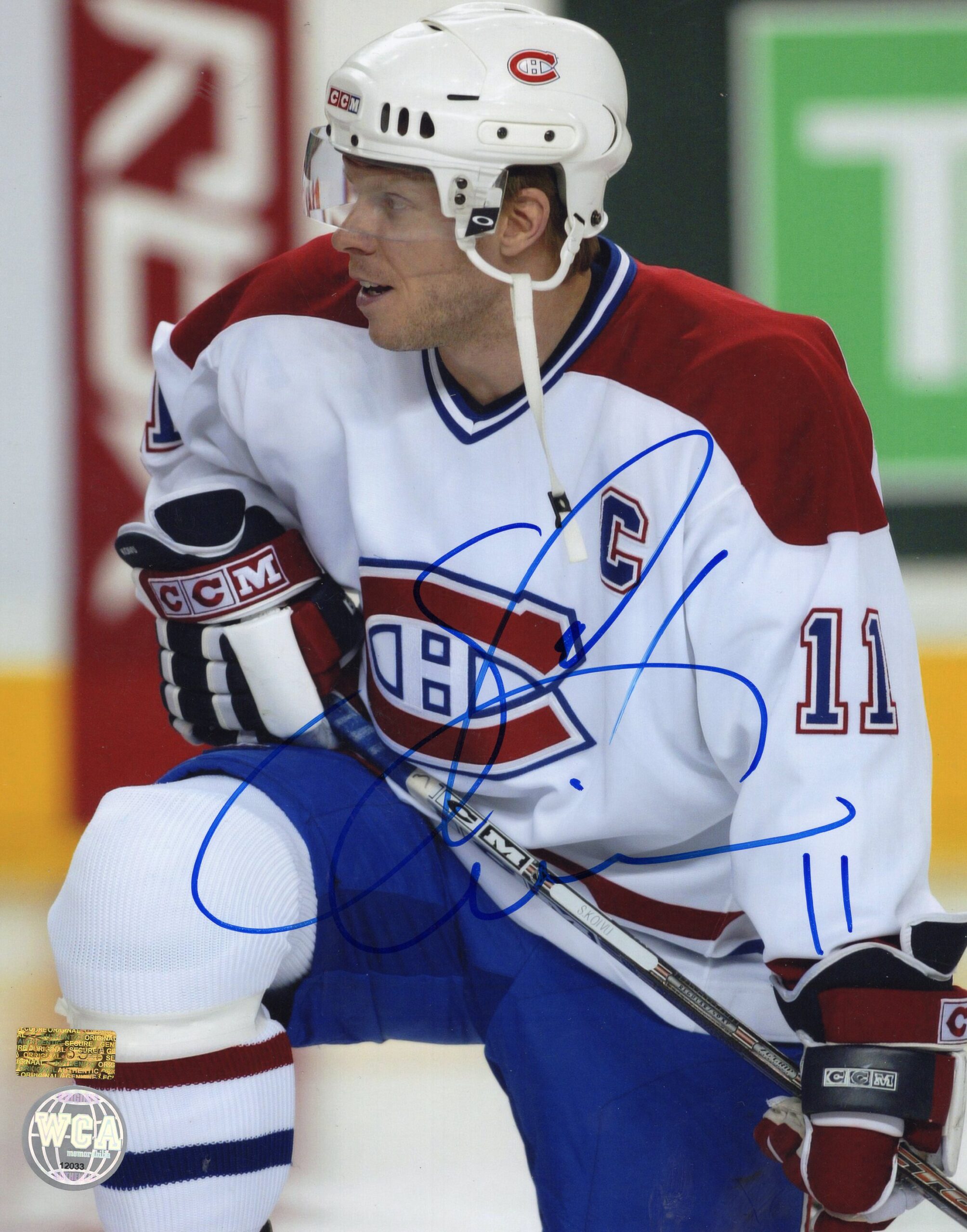 This is an official 8×10 glossy photograph of legendary NHL centre Saku Koivu in his Montreal Canadiens white (away) jersey, captured in action — often shown bent on one knee, protecting the puck or firing a shot during gameplay. Koivu’s intense focus and competitive posture make this a dynamic and visually appealing image for any Canadiens fan or hockey memorabilia collector.