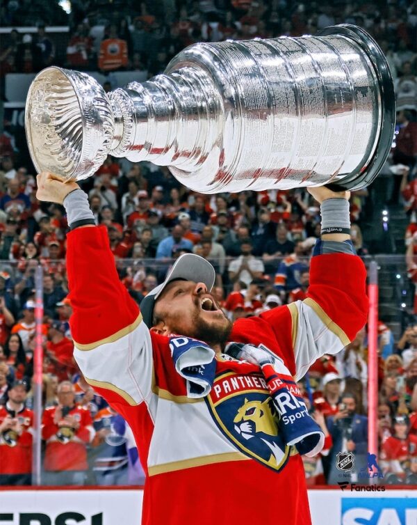 Sam Reinhart Florida Panthers Unsigned 2024 Stanley Cup Champions Raising Cup Photograph
