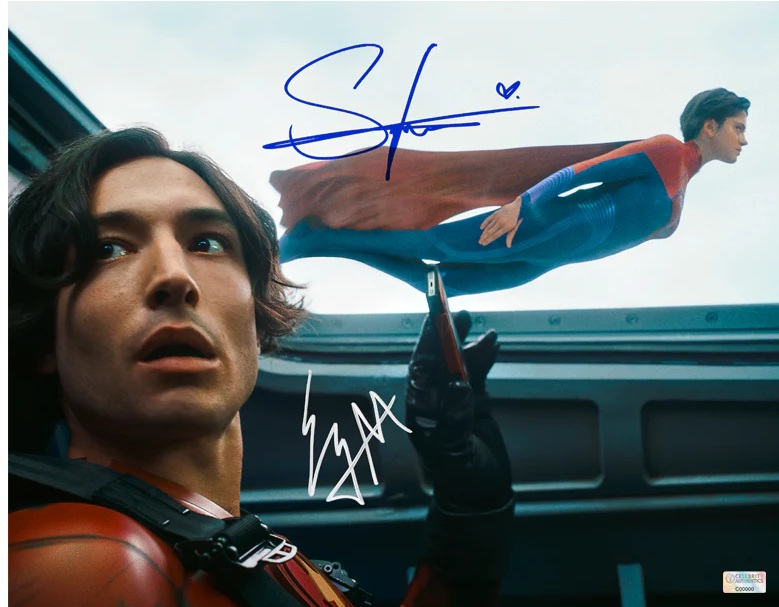 This 2023 The Flash Supergirl for the Kids 11x14 Photo autographed by the Scarlet Speedster himself, Ezra Miller, and Supergirl, Sasha Calle during their signings with Celebrity Authentics. Great shot capturing the scene of young Barry Allen taking a picture of Supergirl in flight and referencing to older Barry that he's taking a picture for their future kids. Ships affixed with Celebrity Authentics serial-numbered Authentication hologram and includes Celebrity Authentics Certificates of Authenticity featuring pictures of Sasha and Ezra signing photo.