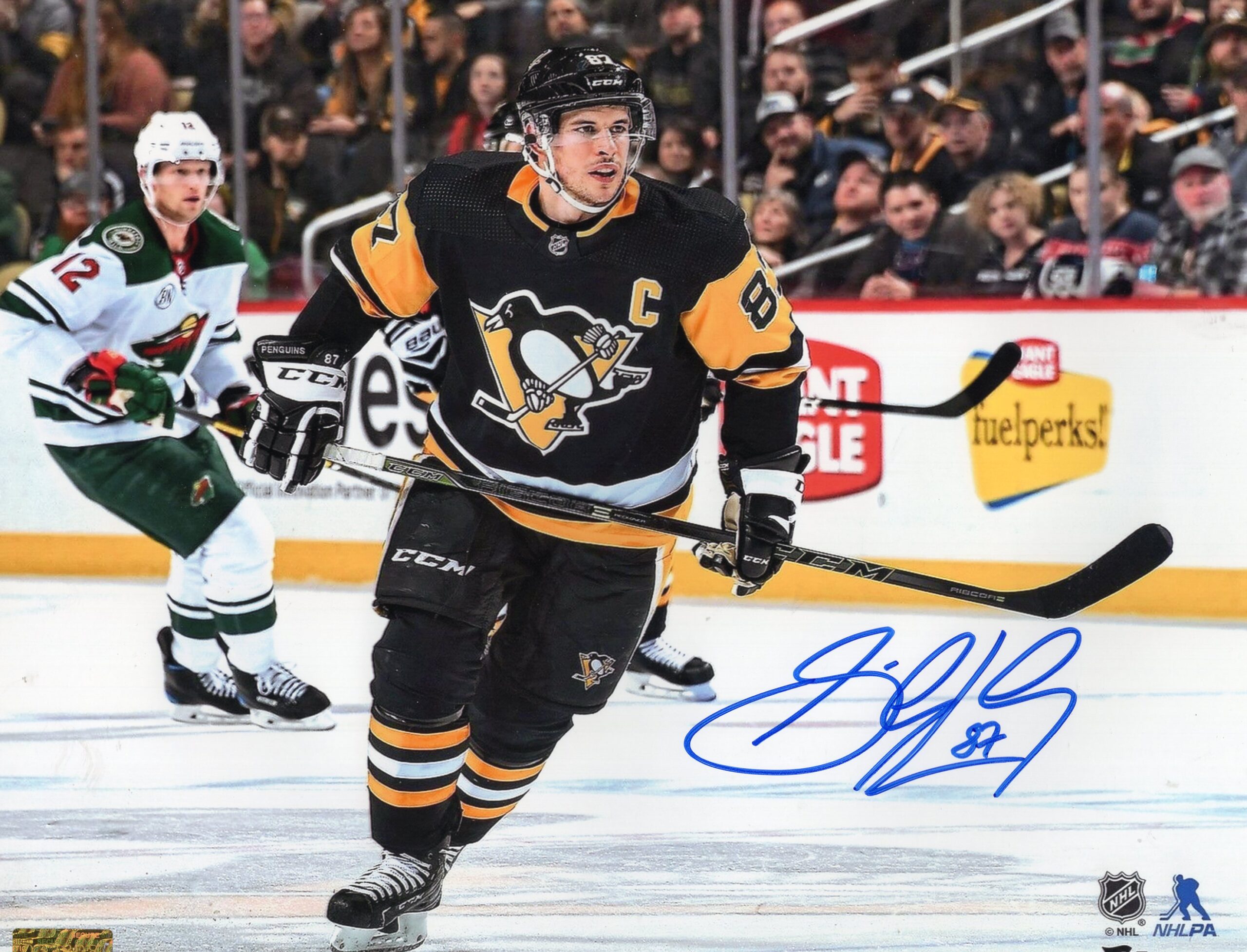 wn a piece of hockey history with this Sidney Crosby Pittsburgh Penguins Black Jersey Autographed 8x10 Photo. This stunning image captures the Penguins captain in the team’s eye-catching gold jersey, showcasing Crosby’s intensity, leadership, and elite skill that have defined his legendary career.