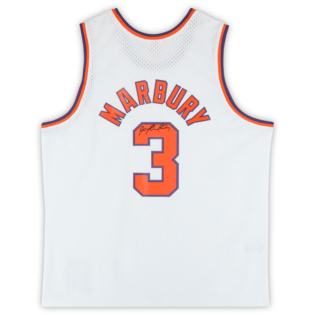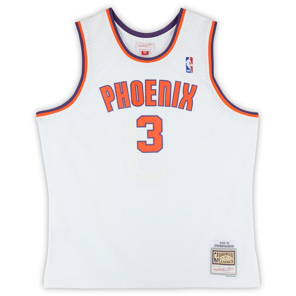 Elevate your collection of Phoenix Suns memorabilia by picking up this Stephon Marbury autographed Mitchell & Ness 2002-03 White Alternative Swingman Jersey. Featuring a striking signature from the Phoenix Suns star, it's a must-have addition for any die-hard fan or serious collector. This collectible also includes an individually numbered, tamper-evident hologram that can be verified online to certify its authenticity.