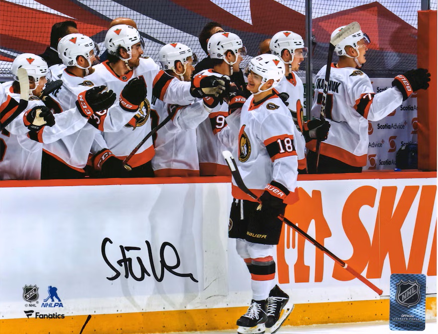 Tim Stutzle Ottawa Senators Autographed 16″ x 20″ Hat Trick Celebration Photograph with “1st NHL HAT TRICK 5/8/21” Inscription