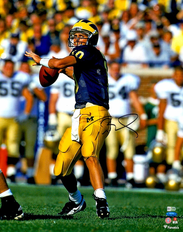 Take your Michigan Wolverines memorabilia collection to the next level with this Tom Brady Autographed 16" x 20" Blue Throwing Photograph. Whether displayed in your home or office, there's no better way to display your appreciation for arguably the greatest player in NFL history. Brady started his career as a Wolverine and spent three years behind Brian Griese, who led the team to an undefeated national championship season in 1997. Brady split playing time with freshman Drew Henson the following year, but he ultimately started every game in each of his final two seasons in Ann Arbor. Two All-Big Ten honorable mentions and two bowl game wins later, Brady was drafted in the sixth round by the New England Patriots. The Michigan grad went on to win more Super Bowls than any one franchise has total.