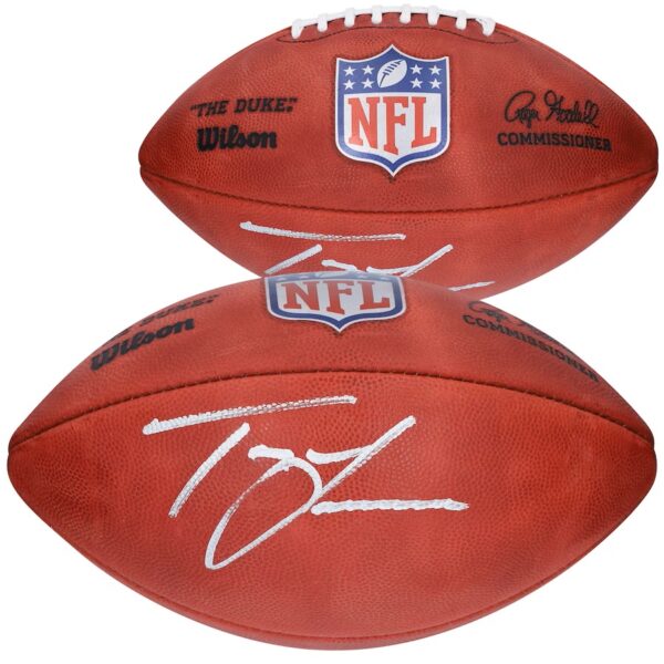 Showcase your die-hard Jacksonville Jaguars fandom by picking up this Trevor Lawrence autographed Wilson Duke Full Color Pro Football. Following a storied collegiate career at Clemson, the Jaguars drafted Lawrence number one overall in the 2021 NFL Draft. In his sophomore season, he threw for 4,113 yards and 25 touchdowns to only eight interceptions, which helped lift the Jags to an AFC South title and their first postseason appearance in five years. In their Wildcard matchup against the Los Angeles Chargers, Lawrence led the team to a victory after being down by 27 points, making it the third-largest comeback in NFL Playoff history. There's no doubt that Trevor Lawrence will be a key member of the Jacksonville Jaguars for years to come, so show your excitement by making this signed football part of your collection.