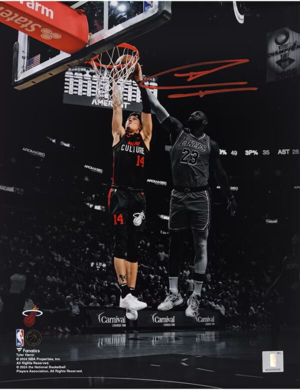 Showcase your favorite Miami Heat player with this Tyler Herro autographed 11" x 14" Spotlight Dunk vs. Los Angeles Lakers Photograph. Featuring Herro's distinct signature, this unique collectible provides the perfect authentic centerpiece to be the focal point of your ever-growing Miami Heat memorabilia collection. Plus, this photo includes an individually numbered, tamper-evident hologram that can be verified online to certify its authenticity.