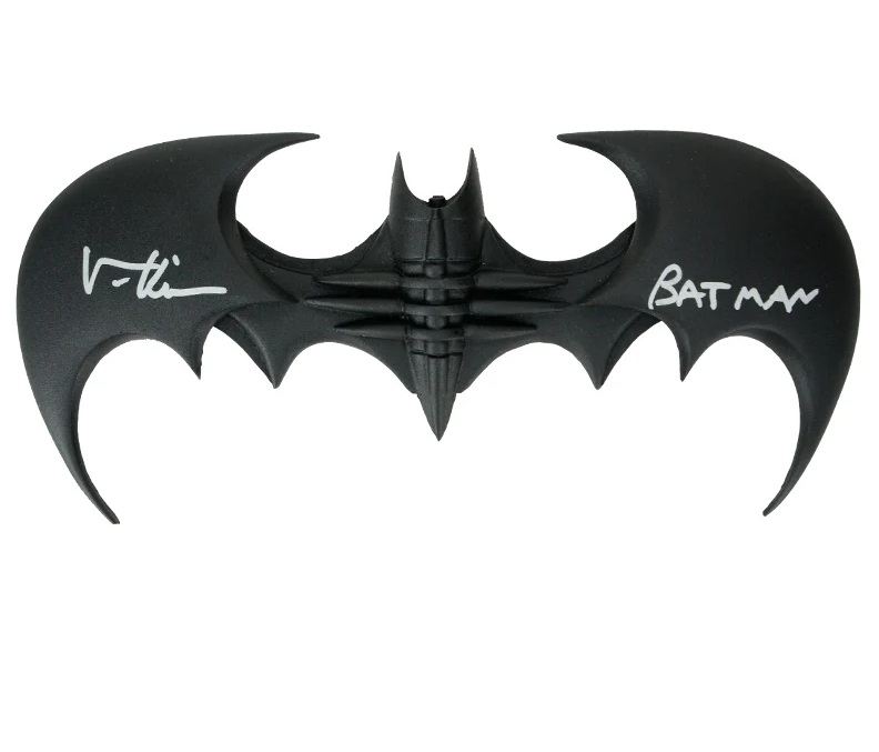 This Batman Forever Batarang has been personally hand-signed by the Caped Crusader himself, Val Kilmer during his autograph signing with Celebrity Authentics. This film accurate Batarang measures approximately 10 inches in width and is cast in hard resin. Batman (Val Kilmer) faces off against two foes: the schizophrenic, horribly scarred former District Attorney Harvey Dent, aka Two-Face (Tommy Lee Jones), and the Riddler (Jim Carrey), a disgruntled ex-Wayne Enterprises inventor seeking revenge against his former employer by unleashing his brain-sucking weapon on Gotham City's residents. As the caped crusader also deals with tortured memories of his parents' murder, he has a new romance, with psychologist Chase Meridian (Nicole Kidman). Ships affixed with the Celebrity Authentics serial-numbered and tamper evident Authentication Hologram and includes Celebrity Authentics Certificate of Authenticity featuring picture of Mr. Kilmer signing batarang.