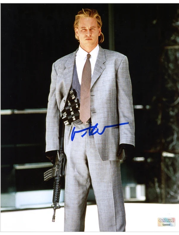 This 8x10 photo from the crime thriller Heat has been personally hand-signed by Val Kilmer who portrayed Chris Shiherlis along side Robert DeNiro (Neil McCauley) and Al Pacino (Lt. Vincent Hanna) during his signing with Celebrity Authentics. Item ships affixed with the Celebrity Authentics serial-numbered and tamper evident Authentication Hologram and includes Celebrity Authentics Certificate of Authenticity featuring picture of Val signing photo.