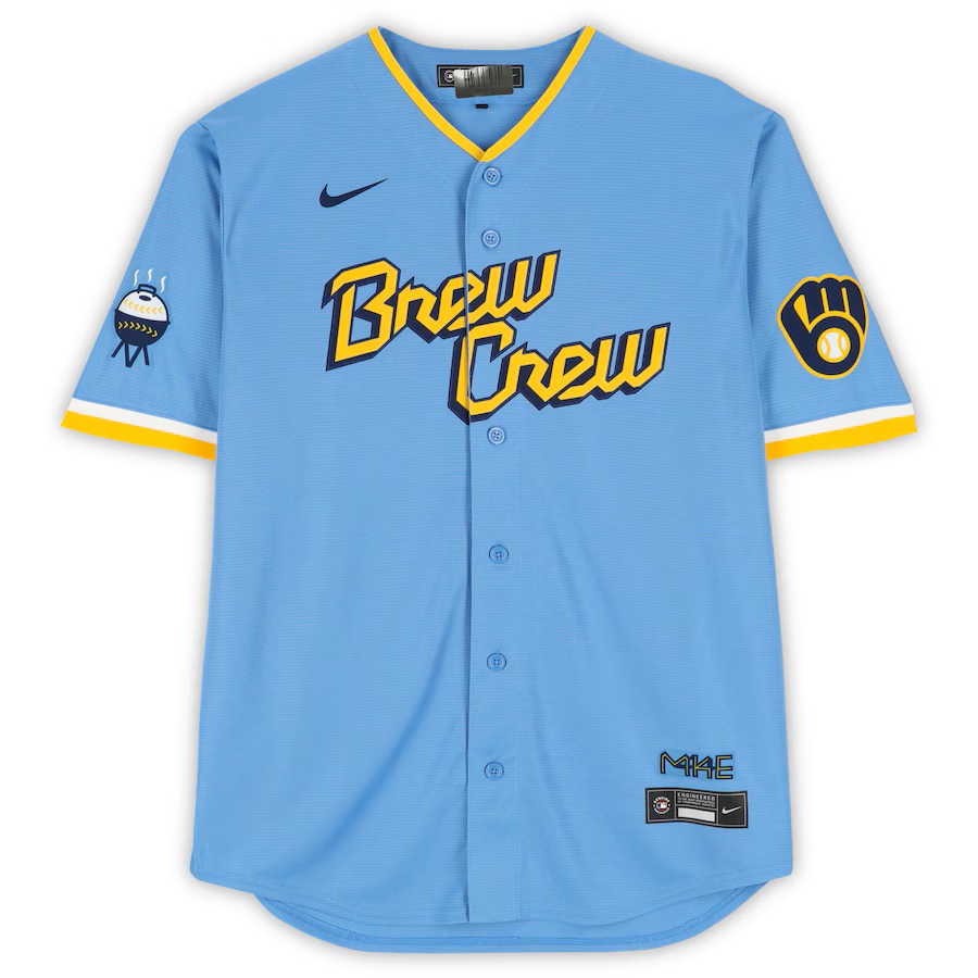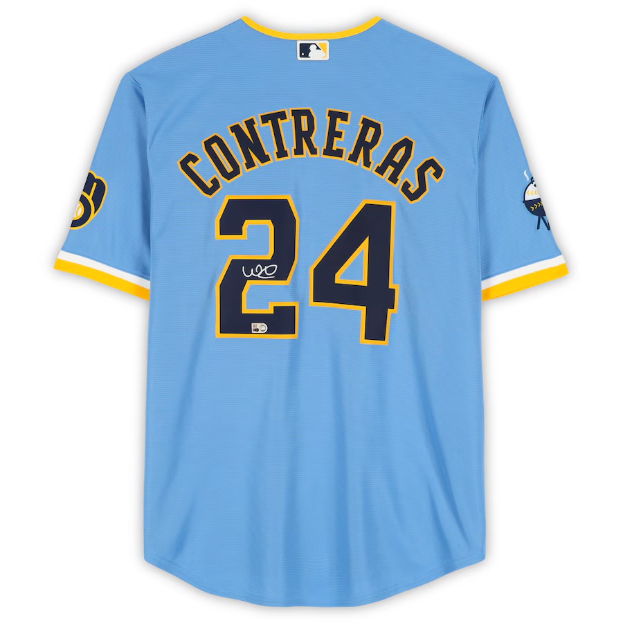 Elevate your collection of Milwaukee Brewers memorabilia with this William Contreras autographed Powder Blue Nike City Connect Replica Jersey. It features eye-catching details and a distinct signature from the star catcher. Obtained under the auspices of Major League Baseball, this collectible includes an individually numbered, tamper-evident hologram that can be verified online to certify authenticity.